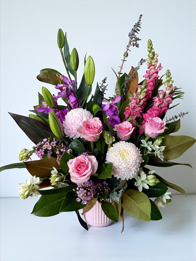 Front facing beautiful combination of pink hue flowers in ceramic container.