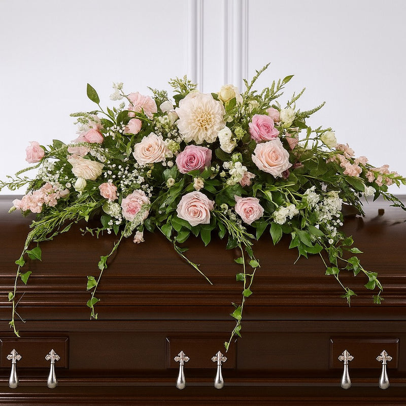 Pink and white toned 1 metre long funeral casket. Casket will inspired by this picture. Substitutions applies depending on availability.