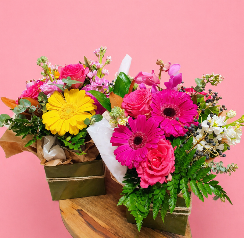 Florist Choice small posy box. Photo is example of size, colours will vary and will be mixed. Flowers will vary depending on availability. Substitutions will apply. This photo will be a reference and the main inspiration.
