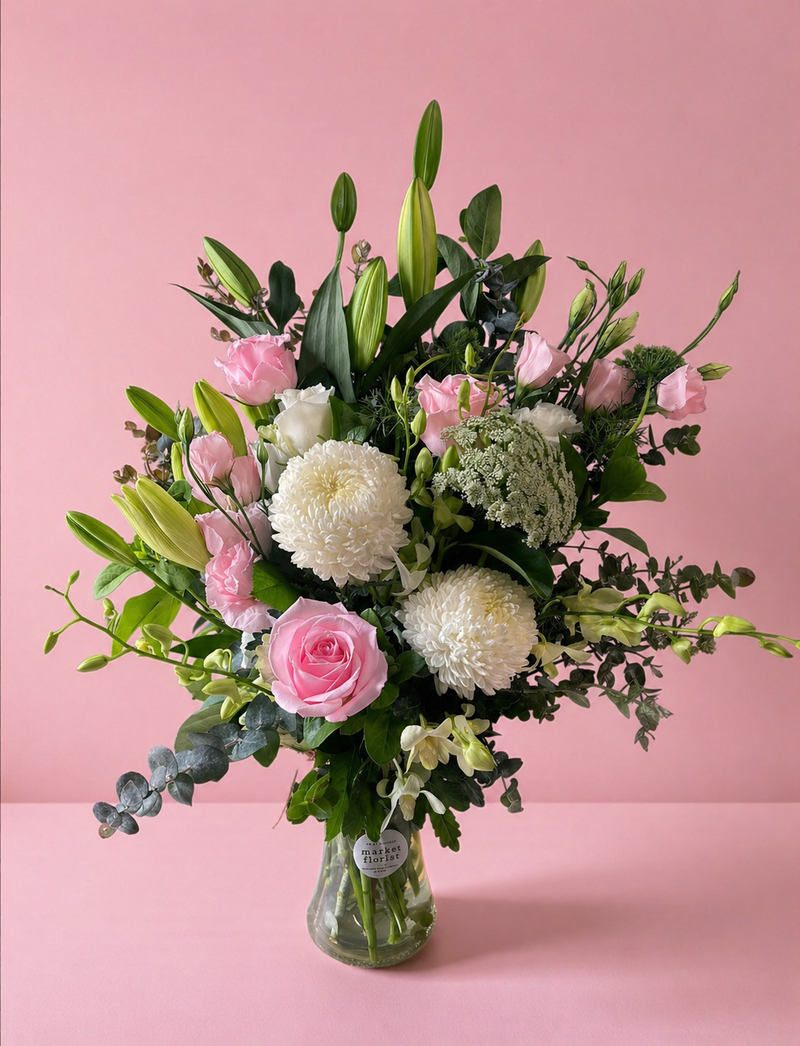 Seasonal pastel vase. Flowers will vary depending on availability. Substitutions will apply. This photo will be a reference and the main inspiration.