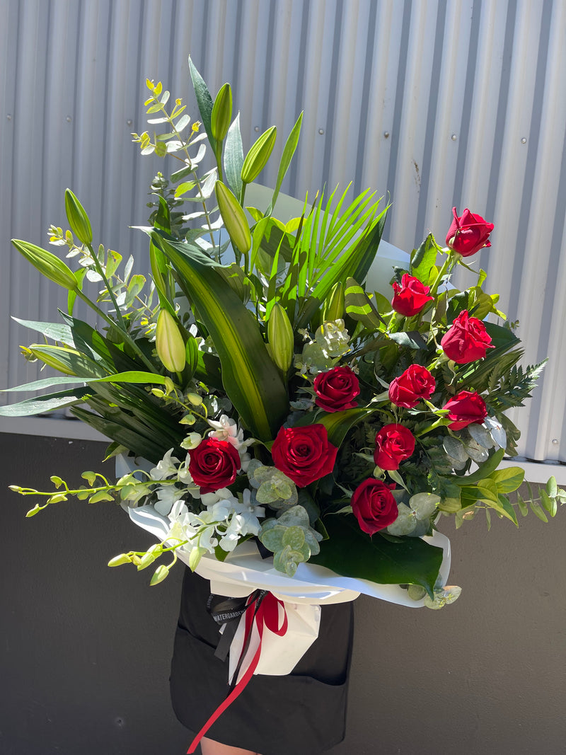 10 long stem red roses, lilies and orchids all in one long stem bouquet.