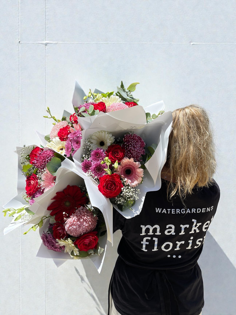 1x bunch of mixed flowers including 2 red roses. Other flowers will vary depending on availability.